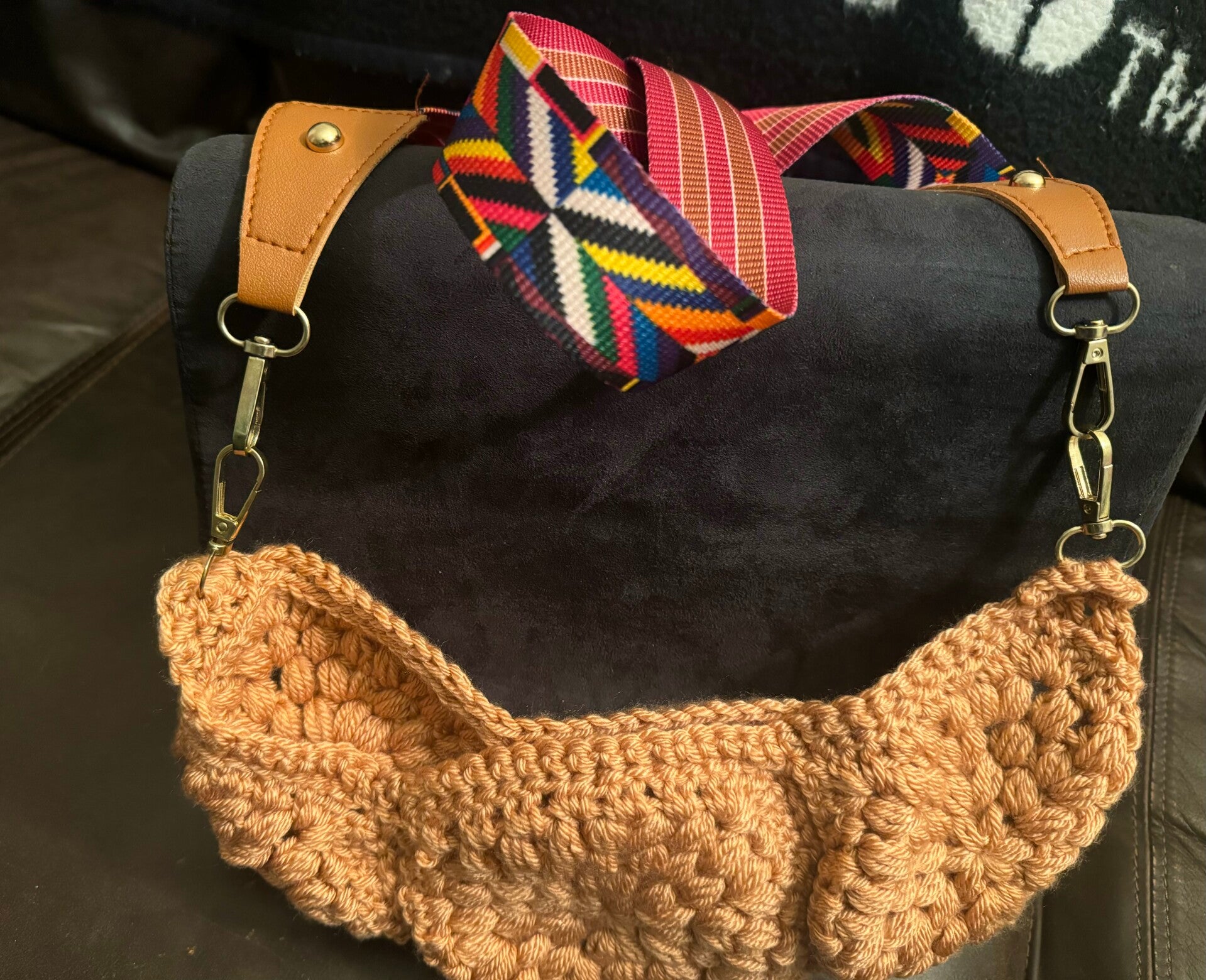 Rust colored cotton crossbody, perfect for on the go! Black embellishment on the front. Also available in peach with detachable strap.